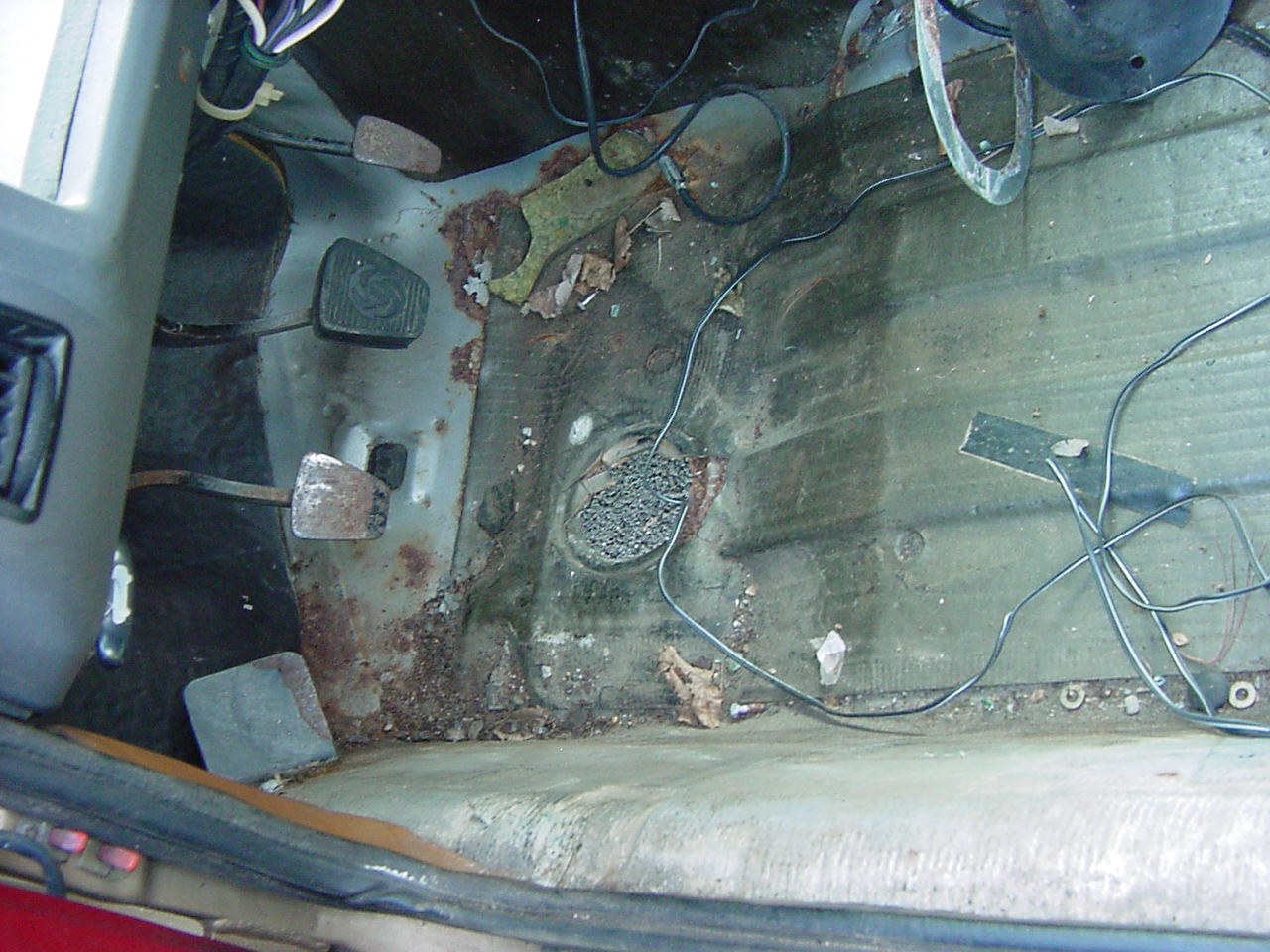 The seat belt sensor wiring under the driver's seat shorted out some while ago, resulting in an electrical fire (or at least a good bit of heat!). This caused the rust seen in the following pic: As you can see, the floorboards are actually in good shape, despite the car's exposure to the elements before my purchase